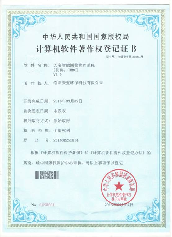 公司溶劑回收設(shè)備的控制系統(tǒng)--------“天寶智能回收管理系統(tǒng)”獲國家版權(quán)局下發(fā)的軟件著作權(quán)登記證書。該證書的取得,表明了公司開發(fā)的有機廢氣回收設(shè)備的自動化控制系統(tǒng),同公司取得的發(fā)明***一樣,得到了國家權(quán)威管理部門的認可,是公司自主知識產(chǎn)權(quán)和核心技術(shù)的一個重要組成部分。對于提升公司產(chǎn)品品質(zhì)和智能化控制與操作水平,提高市場競爭力,形成持續(xù)創(chuàng)新能力有著積極的促進作用。